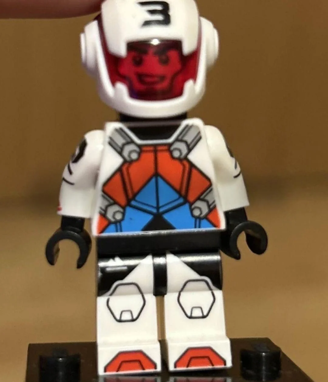 Jetpack Racer - This Minifigure comes in a mainly white racing suit with some hints of black and stripes of blue and red on his torso. He looks to include a brand new helmet piece with a red visor allowing us to see one of two facial expressions included with the Minifigure. A brick-built jetpack is obviously attached to his back.