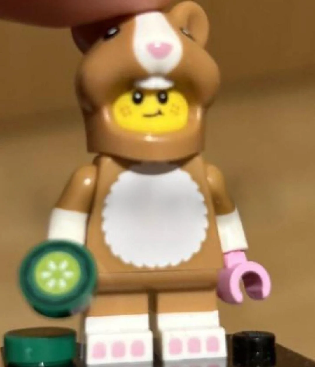 Hamster Costume Fan - A young girl with small legs in a brown and white hamster costume. She comes with a new headpiece to recreate a chubby but cute Hamster face along with an accessory of a round 1x1 tile used to signify hamster food.