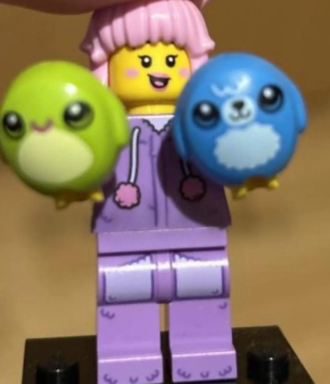 Plush Toy Collector - A brand new idea from LEGO with a Minifigure obsessed with plush toys. She includes two of them here which both look to include brand new moulds to create some wacky collectable toys in the Minifigure world. One is green whilst the other is blue to create a very colourful Minifigure that includes pink hair and purple torso and legs.