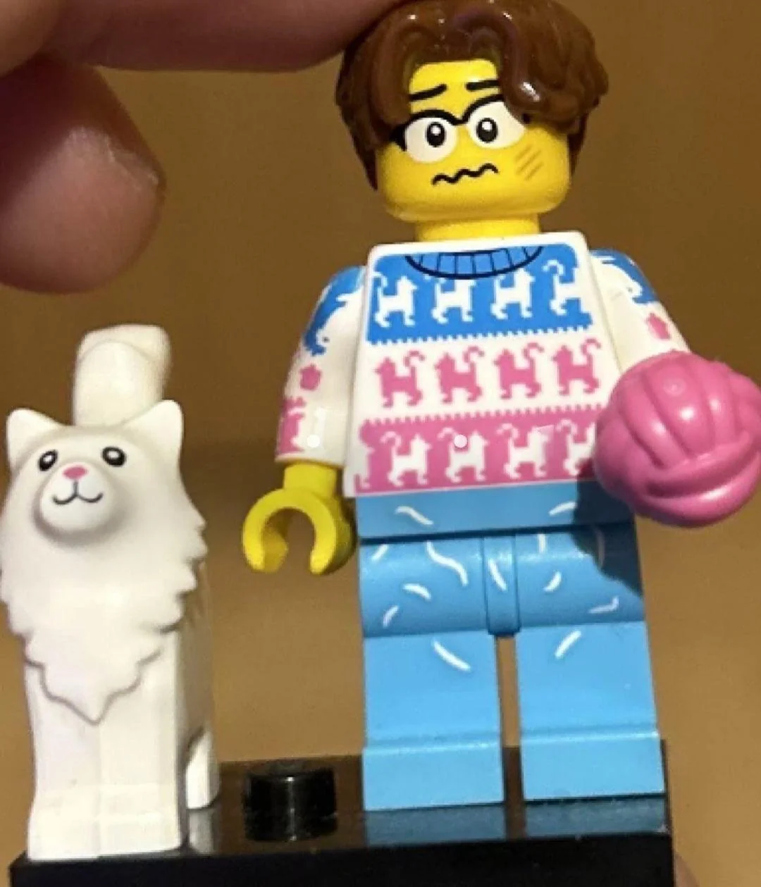 Cat Lover - I guess this should also be called the crazy cat love as this figure seems to be obsessed with feline friends. An exclusive white moulded cat is included here along with a ball of wool. The Minifigure seems to be an expert with wool and knitting jumps as shown by the exclusive printed torso filled with even more cat references.