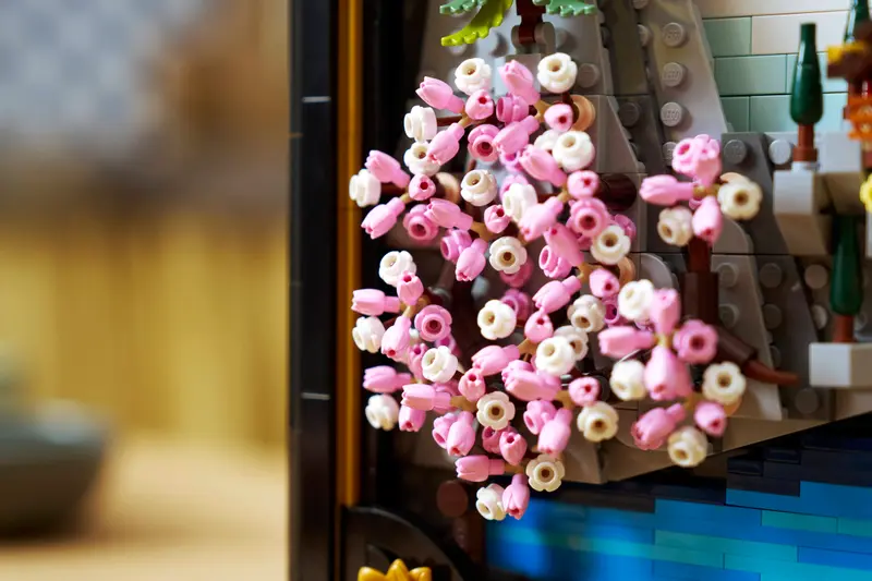 The artistic LEGO model celebrates Springtime in Japan through the lens of the Ukiyo-e movement. Within the black frame, decorated with golden LEGO elements, are some of Japan's most iconic elements and colours. There's Mount Fuji, a teahouse, a bridge, a waterfall, flying Japanese cranes, cherry blossoms, ’Sango-Kaku’ maple and Japanese umbrella pine trees.