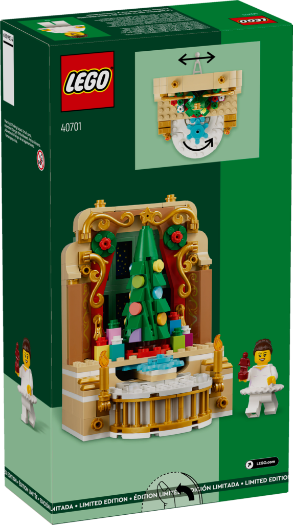 The 9+ model recreates a beautiful Christmas diorama of a spinning Ballerina with a Nutcracker in her hand. The Ballerina is the only Minifigure included in 40701 and comes with a white tutu and a fully white torso and legs. She holds a red microscale figure in her hand, used to represent the nutcracker. Together, they stand on a light blue section used to signify ice that can be twisted using cog pieces to make the figure spin and dance.