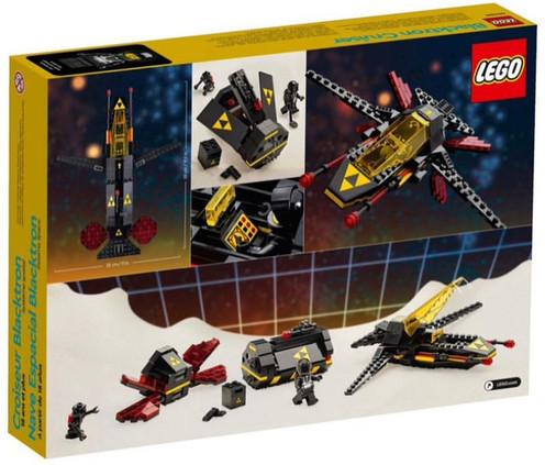 The set is a recreation of 6894 Invader, which was first released in 1987. The new version includes almost 200 more pieces with a total of 356. These help to make the black and yellow cruiser which features a couple of stickers on the bodywork of the Blacktron logo. A different piece is used for the cockpit but still allows enough space for one Minifigure to sit in.