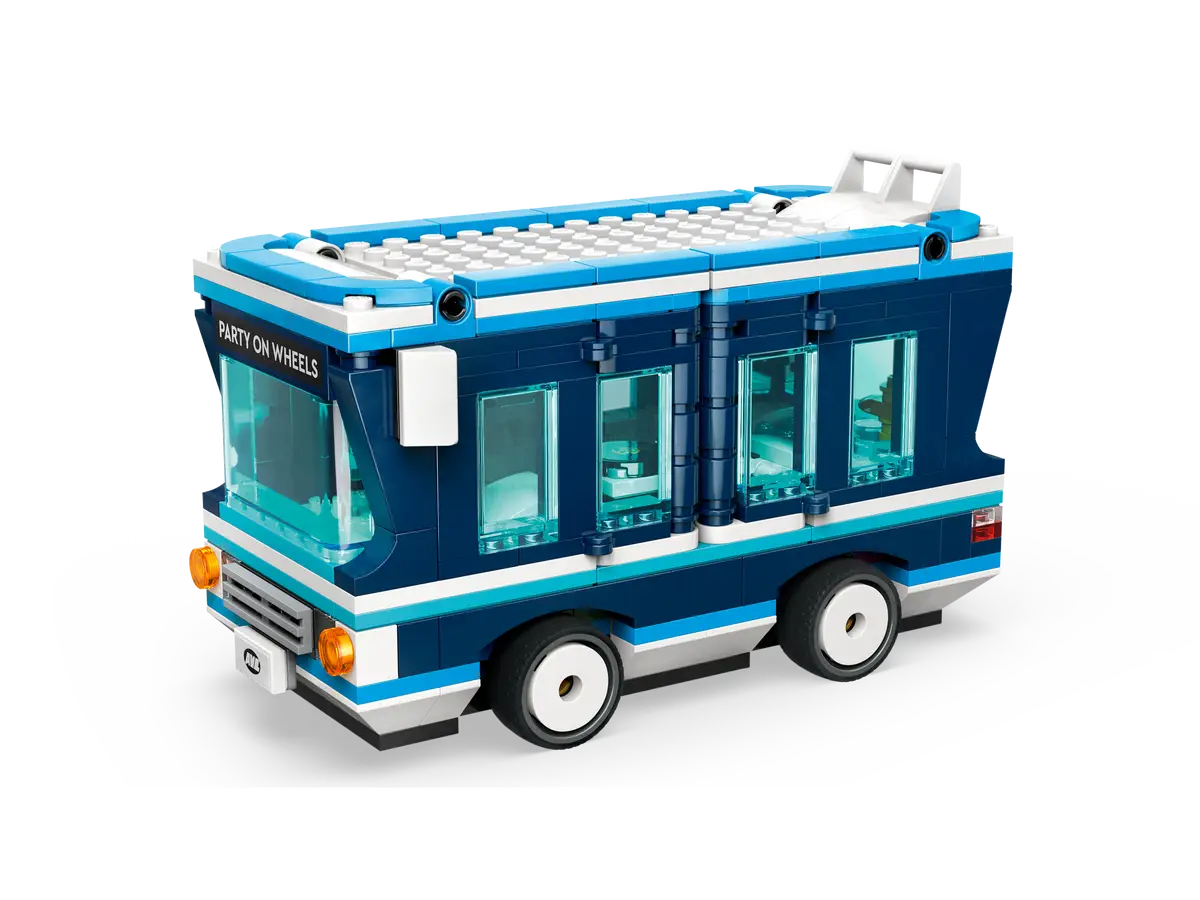 For only almost 400 pieces, unsurprisingly the bus build isn't huge but the blue vehicle still includes many features along with a hectic party taking place inside. The bus has a driver's seat at the front with a hot tub at the rear. Both of these sections can be moved so that the whole bus is opened up allowing access to a dance floor and a DJ section. A ballon, some food and drink and a couple of stickers of partying minions are also included in the bus.