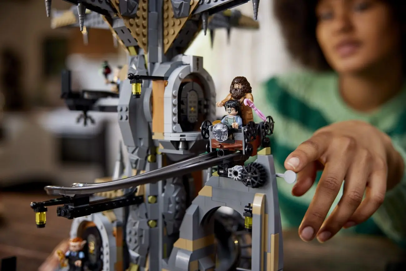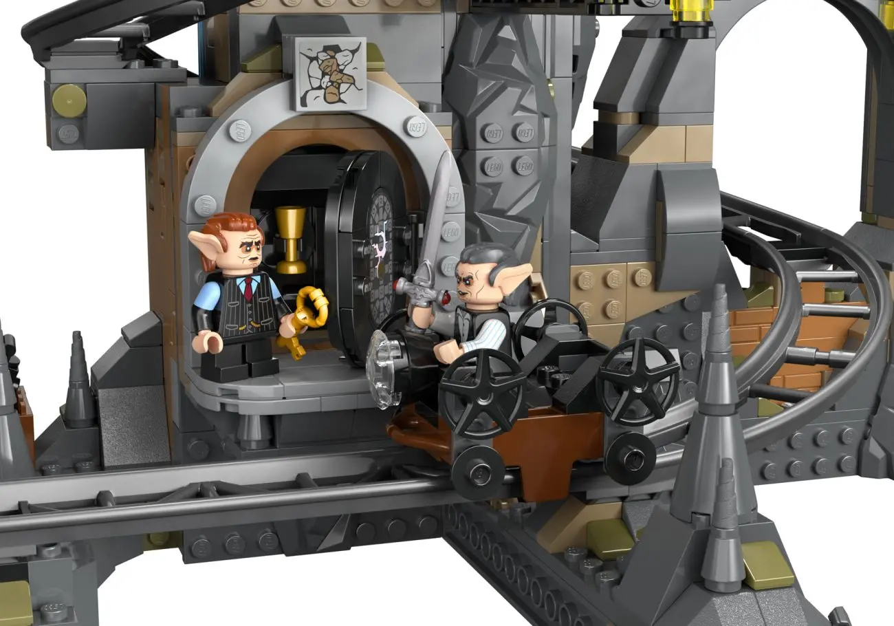 This also means that the minecart system itself can be played with and displayed separately but it is still included in the $430 set. A drop-down feature is included so that the minecarts can properly get some speed before zooming around all the vaults. The feature spirals through each of the three dungeons included including Bellatrix's dungeon with a hidden surprise.