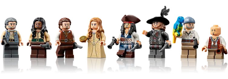 Alongside the mighty vessel, nine LEGO Minifigures are included, all exclusive to the September 2025 model with updated printing, accessories, and in some cases, new moulds. These figures are Captain Jack Sparrow, Hector Barbossa, Elizabeth Swann, Will Turner, Anamaria, Joshamee Gibbs, Cotton, Marty and the previously mentioned sand green figurehead at the front of the Black Pearl.