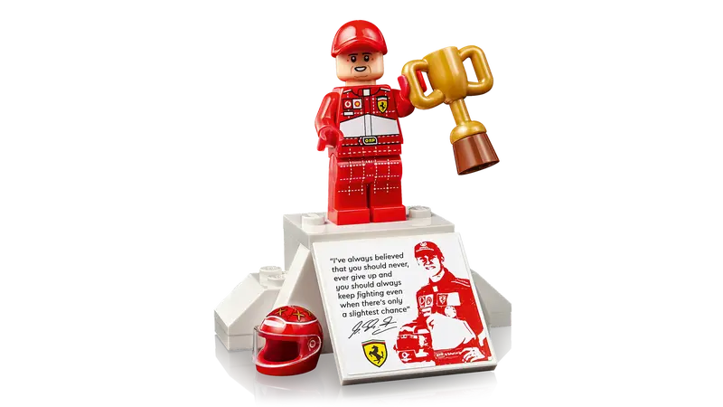 Play features of the 18+ set include a working steering wheel and the ability to remove the engine cover to reveal the Ferrari V10 engine. The entire model then sits on a grey, adjustable display stand that also features a printed information plaque about the iconic Italian vehicle. The Schumacher Minifigure can also be found on his own separate stand with a printed quote, trophy and exclusive helmet design dedicated to one of the sport's greatest drivers.