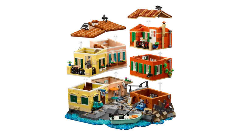 The core build of the original project, which has been heavily translated into the final, official model, includes three different coloured buildings corresponding to three vibrant brick-built shops. The light yellow building represents a diving equipment shop, the pastel pink building corresponds to a gelato shop, whilst a fishmonger's is located in the vibrant orange building, which, unlike the other two shops, is a three-storey LEGO building.