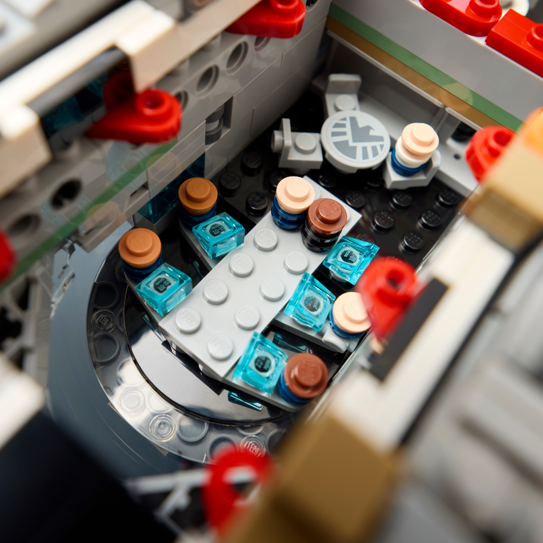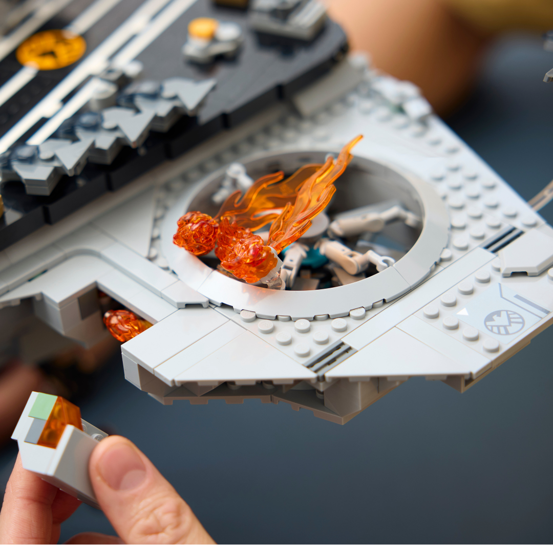 The Helicarrier’s propulsion system is built around four large turbine engines positioned at each corner. These use newly designed circular elements and internal spoke detailing to create a more realistic and mechanical look. Additional engine structures are integrated into the rear, reinforcing the scale and functionality of the aircraft carrier. One section even allows for a damage scenario with LEGO fire pieces, referencing battle scenes from the films.