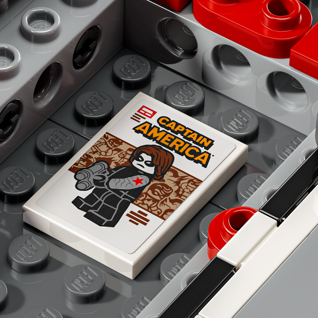 Here, multiple microscale scenes inspired by the Marvel films are recreated in LEGO. These include a control room with tiny crew members, a S.H.I.E.L.D meeting area featuring Nick Fury, Maria Hill, and Phil Coulson in miniature form, and a prison cell that appears to reference Loki’s containment from The Avengers. Additional hidden details include a small Iron Man micro build recreating the turbine repair scene, as well as a collectable comic-style tile based on Captain America’s Winter Soldier storyline.