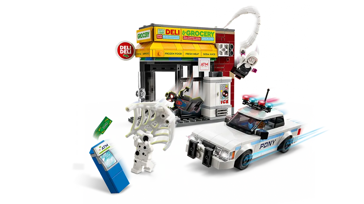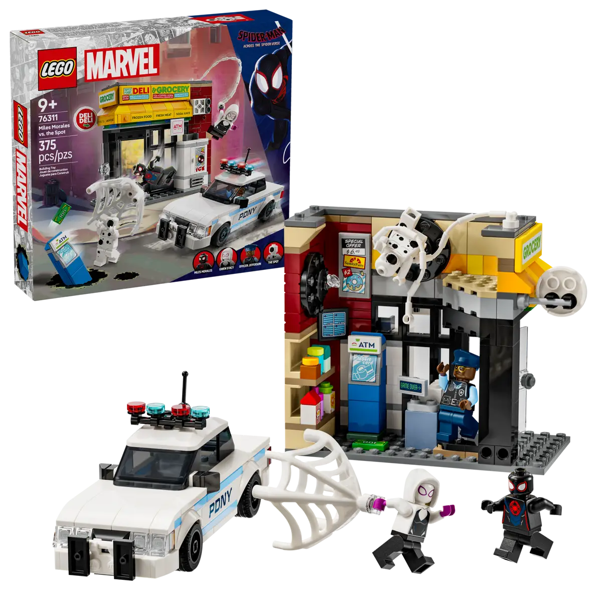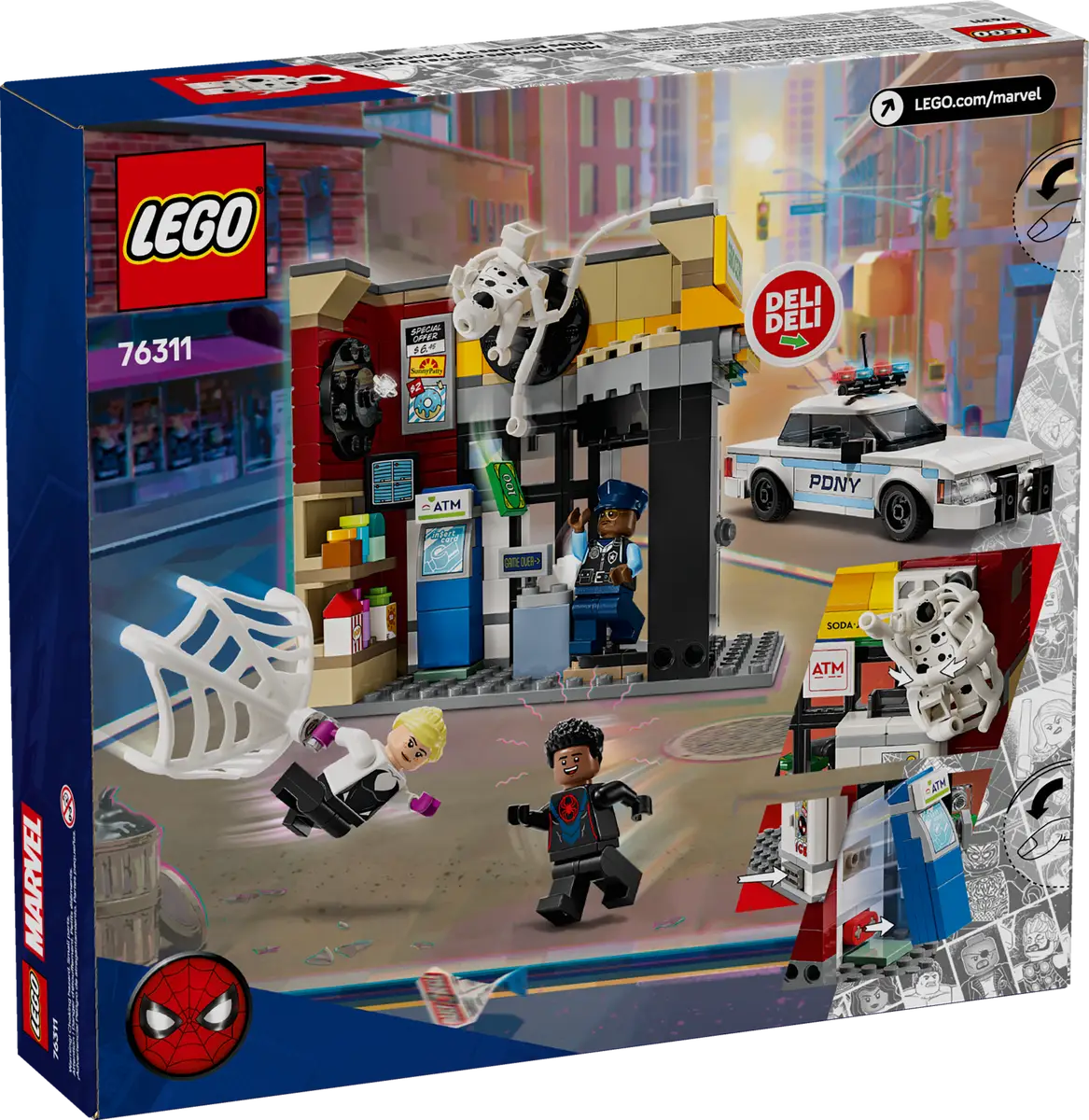 These four figures are Miles Morales, Gwen Stacy, The Spot and Officer Jefferson. Officer Jefferson's white police car is included in 76311 along with a small brick-built convenience store. With no back wall, the shop is relatively easy to access and includes a play feature involving the ATM being removed from the shop and stolen by our supervillain of the set The Spot.