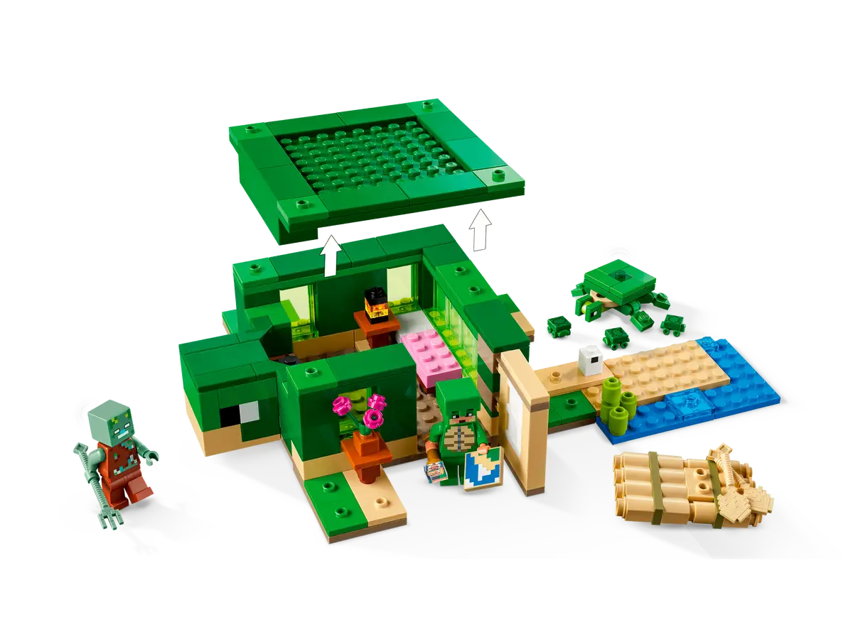 The Turtle Beach House is the main build of the set with different shades of green used to create the turtle shell. A small brick-built head for the turtle is attached here where a furnace and a crafting table are also located on the inside. The rest of the interior of the house includes a lantern, a pink bed and a rich wood door.