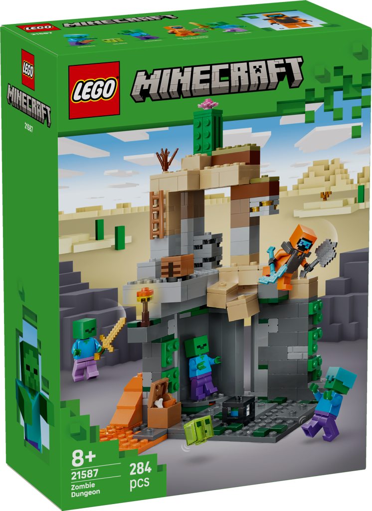 21587 Zombie Dungeon is a classic LEGO Minecraft build, recreating a cobblestone and mossy-brick dungeon swarming with Zombies. At the centre of the brick-built dungeon is a zombie spawner which spawns a total of three Zombies, including one with enchanted leggings. Above the dungeon, we have a small section of the desert biome, allowing space for our adventurous LEGO Minifigure, Wastelands Wanderer, to start mining.