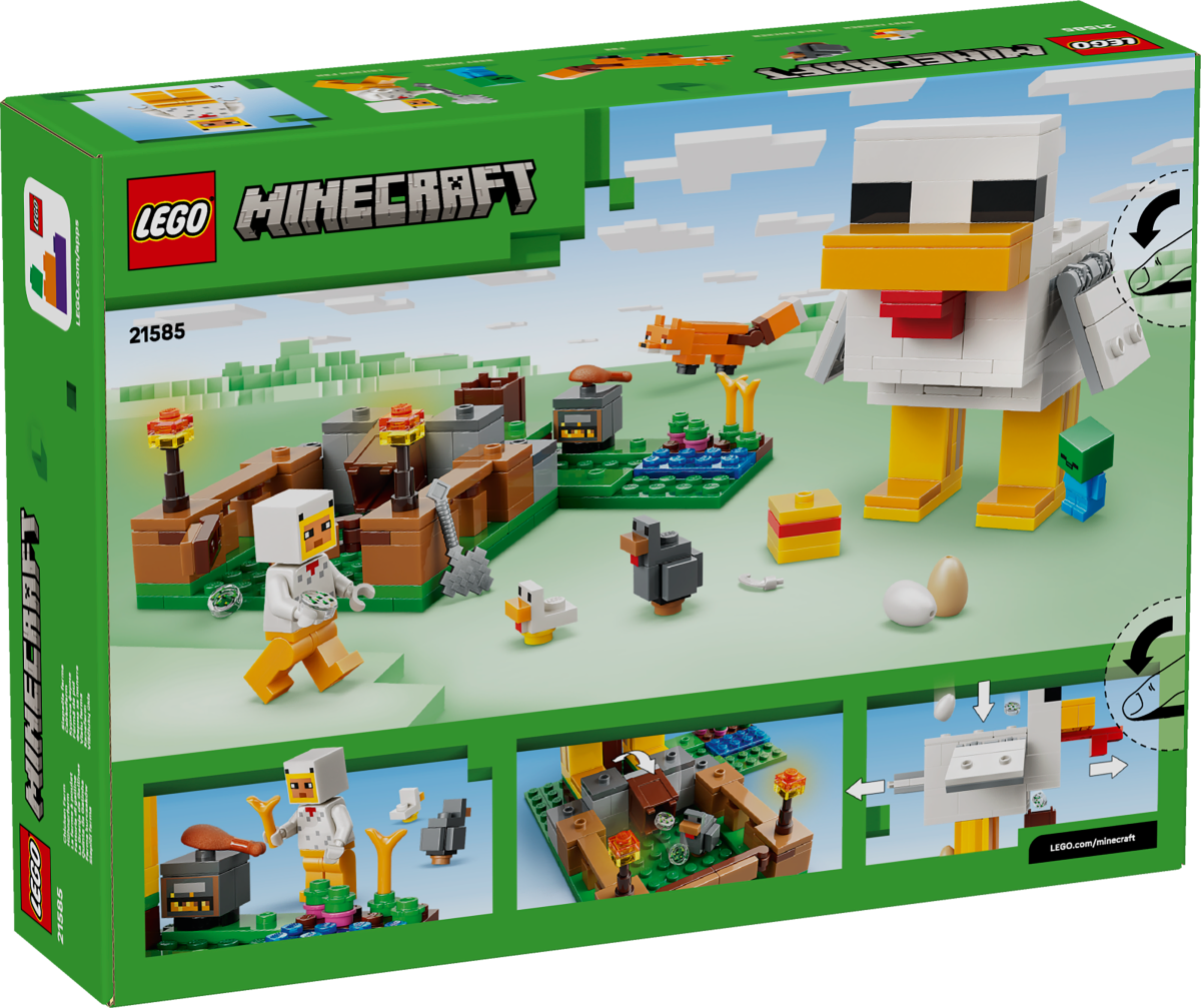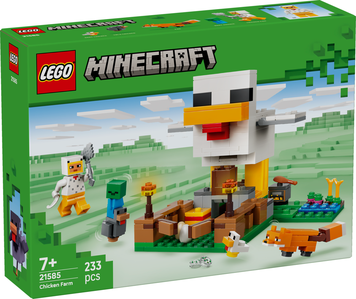 21585 Chicken Farm looks to build on the success of A Minecraft Movie and the popular 'Chicken Jockey' scene. This time, 233 pieces are used to recreate a small farm and brick-built coop shaped exactly like a chicken with moveable wings and a pen at the front with an opening gate. The 7+ model is very much a modern version of 2018's 21140 The Chicken Coop, complete with a Chicken Fan Minifigure skin, a fox, a baby zombie and multiple chickens.