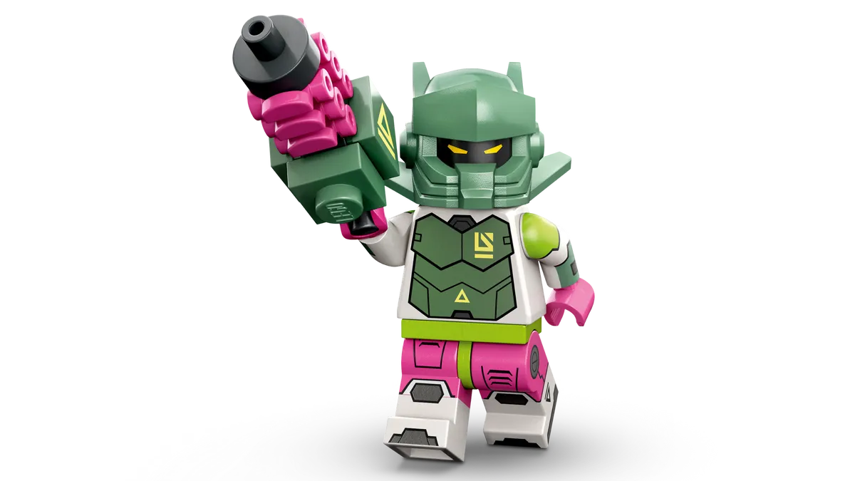 Space Warrior - Quite a cool and colourful Minifigure, the space warrior comes with a green helmet which matches his green armoured torso. He also has some hints of white and pink. His accessory is a space gun which uses an interesting build of two pink rollerskates.