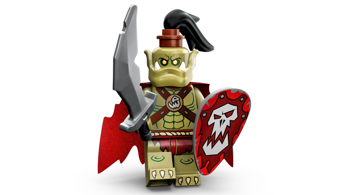 Orc - The Orc is a fictional humanoid monster which is very similar to a goblin. The LEGO version is a light green with different prints on his torso and legs. He also comes with a brand new piece beneath his head to make a more goblin-like face. His accessories are an exclusive shield, a sword and a cape.