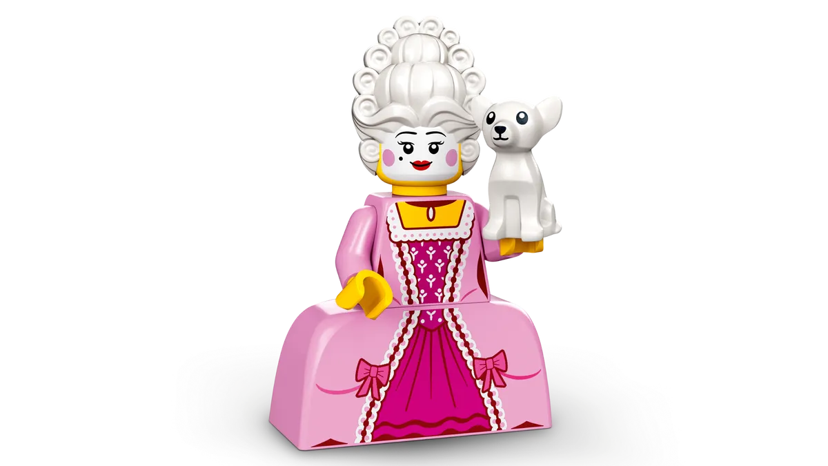 French Lady - We've had a French Man in a previous series and now we've got a French Lady who comes with a wide skirt that stretches over 4 studs. She also comes with a powdered face, a wig and a small white dog.