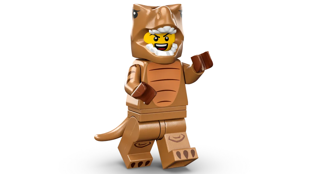 T-Rex Costume - A man in a brown T-Rex costume with a new tailpiece.