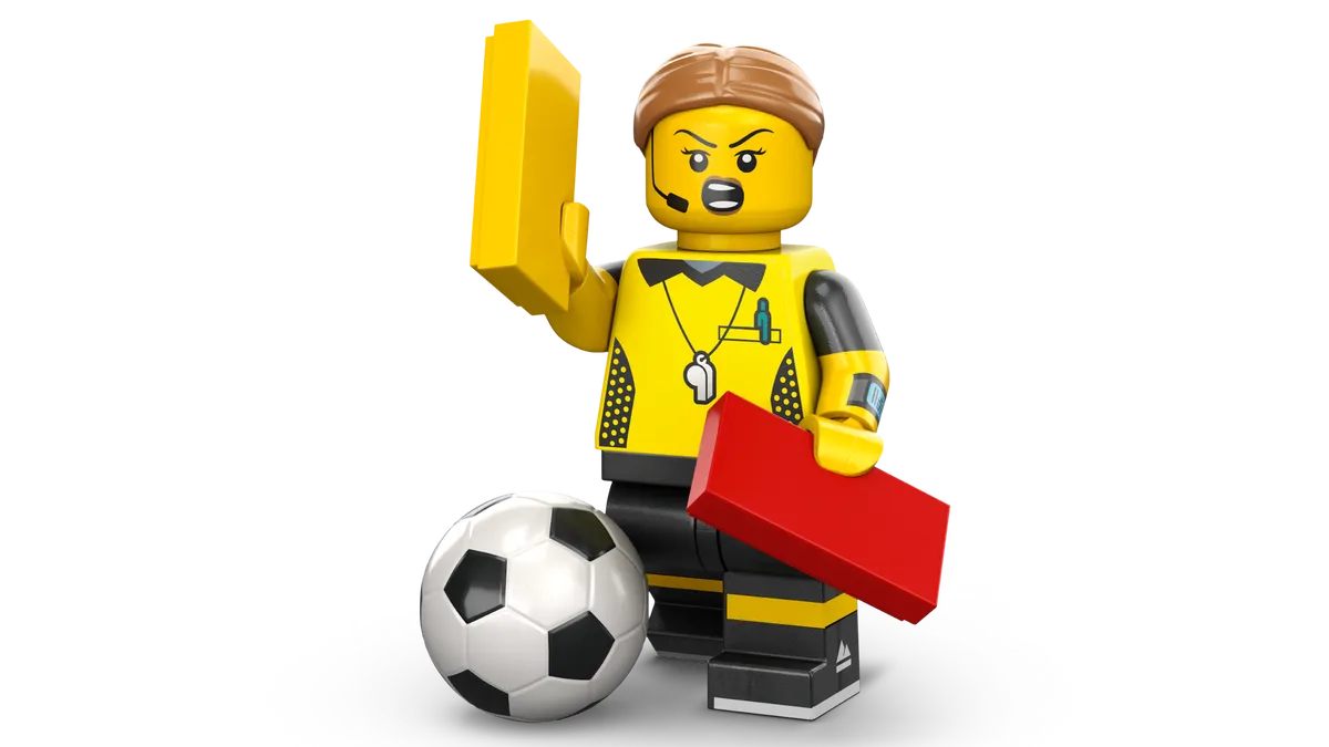 Female Referee - Dressed in bright yellow with black shorts. Includes the usual football pieces and a red and yellow card as accessories.
