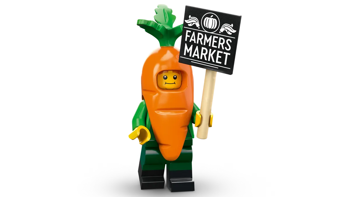 Carrot Costume - Our second costume of the series is a man in a carrot costume. He comes with a "Farmers Market" sign and orange hair which matches the orange of the large carrot piece.