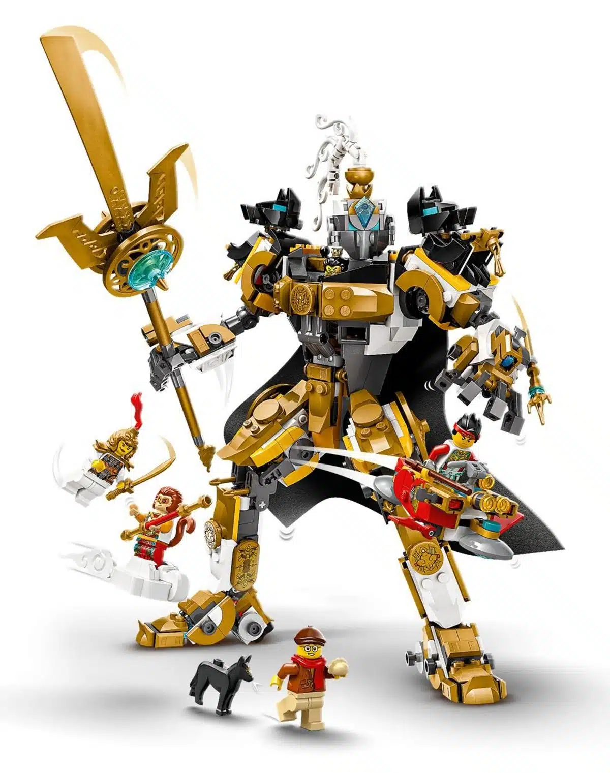 The brick-built mech itself is of a large size and is coloured a mix of gold, white and grey. The model includes the usual moveable arms, legs, head and overall body with it holding a brick-built accessory of a large powerful lance in its hand. Along with the mech and a small flying vehicle for Monkie Kid, a total of five Minifigures are included of Monkie Kid, Monkey King, Mr. Tang, Celestial General and the returning Erlang Shen.