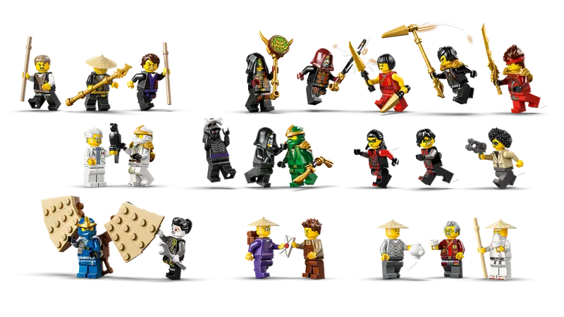 The Minifigure lineup is extremely substantial, covering characters from across NINJAGO history. The set includes 23 Minifigures altogether: Young Wu, Young Garmadon, and The First Spinjitzu Master (all celebrating the 15th anniversary); Faith, Mystake, Krux, Acronix, Garmadon, Ed, Wu, Dr. Julien, Harumi, Jay, Zane, Nya, Cole, Lloyd, and Kai. The 14+ model also includes a postman, a travel agent from the administration, a thief and two Loyalists, including their leader.