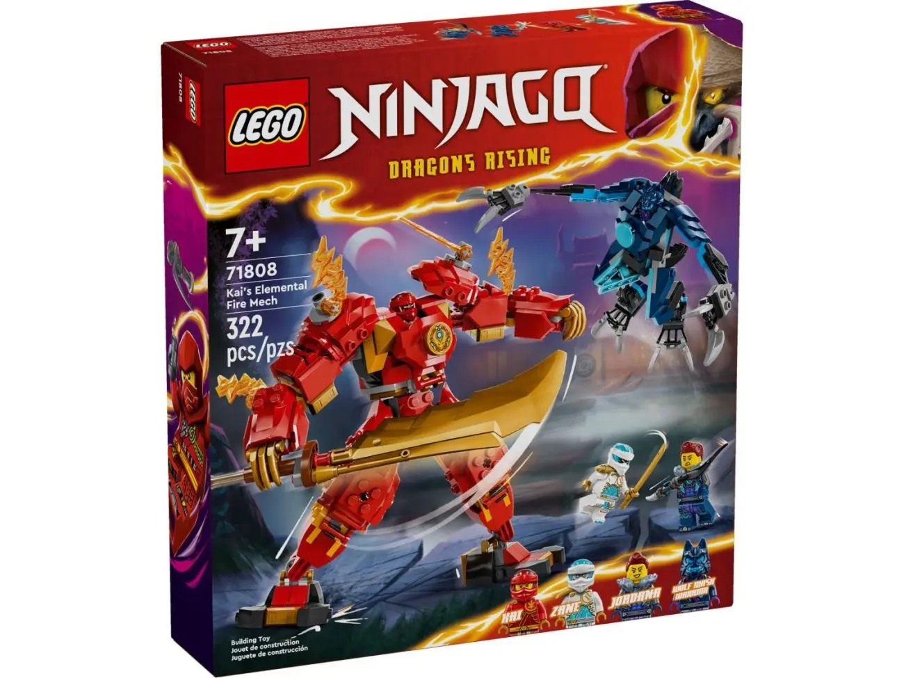 Further sets officially revealed today consist of many small mechs each controlled by a Ninja. There's the 4+ set of 71804 Arin's Battle Mech, 71805 Jay's Mech Battle Pack, 71806 Cole's Elemental Earth Mech, 71807 Sora's Elemental Tech Mech and 71808 Kai's Elemental Fire Mech. The last one of those, 71808 is the largest and most expensive of all the small mech sets with 322 pieces retailing for $29.99.