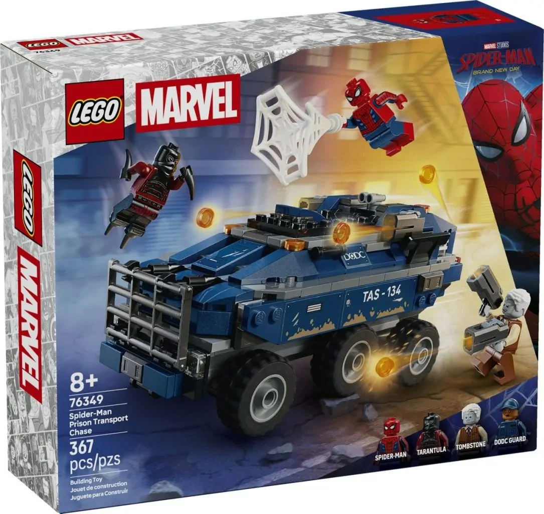 Away from brick-built figures, 76349 Spider-Man Prison Transport Chase is a classic vehicle-driven prisoner escape set commonly seen in the LEGO City theme. The 8+ model is centred on a rugged 6-wheel transport truck which features two stud shooters, an opening roof hatch to access the cockpit and a rear compartment that functions as a mobile prison. Four LEGO Minifigures also make up the $49.99 / €49.99 / £44.99 2026 set.