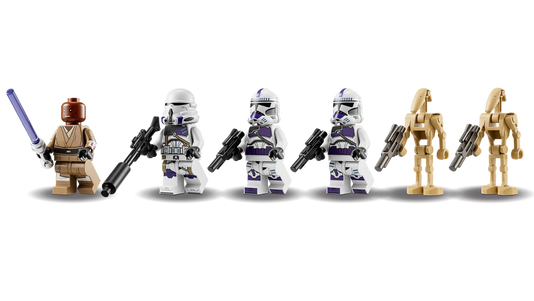 The build itself comes directly from Star Wars: The Clone Wars and Mace Windu’s 187th Legion Clone Troopers battle with the Battle Droids. This also means that Mace Windu with a lightsaber, a 187th Legion Clone Commander with a blaster rifle, two 187th Legion Clone Troopers and 2 Battle Droids are included. Other features of the set include the tank having hidden wheels, spring-loaded shooters and a Minifigure style cockpit.