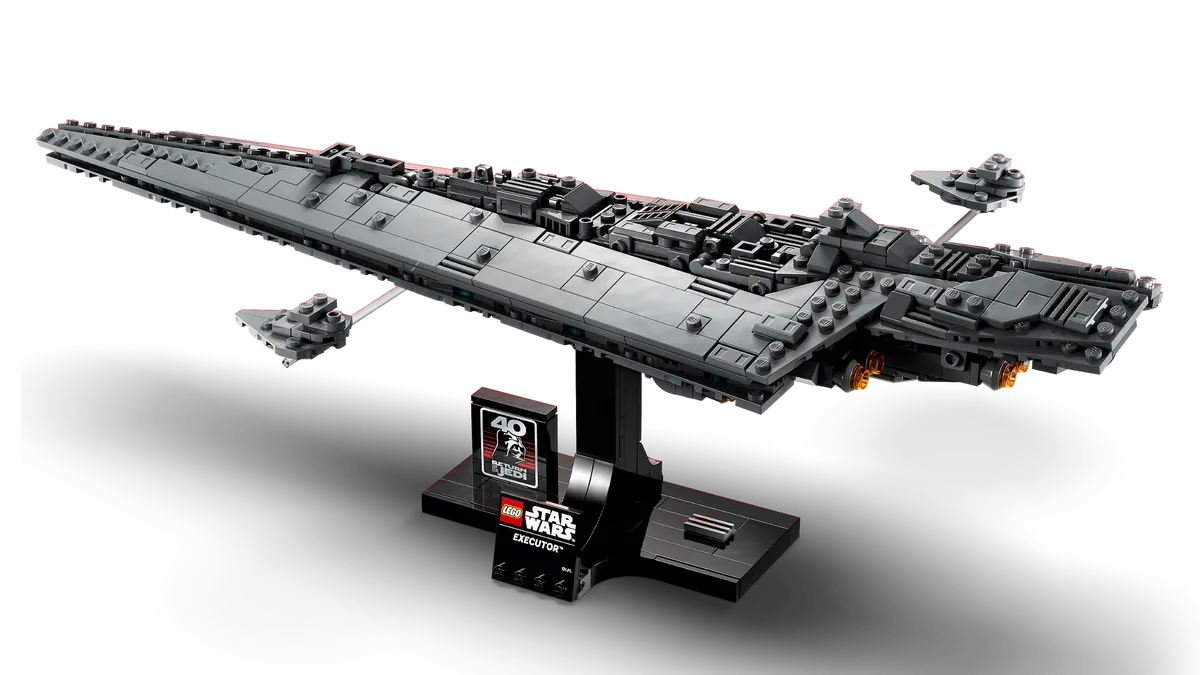 The set of Darth Vader's flagship is based on its appearance in Star Wars: Return of the Jedi which celebrates its 40th anniversary. And to celebrate this, a printed logo of the celebration is included on the black display stand that the giant ship sits on. Altogether, the set measures 43 cm long and 18 cm wide with two small-scale star destroyers also included along with the main ship.