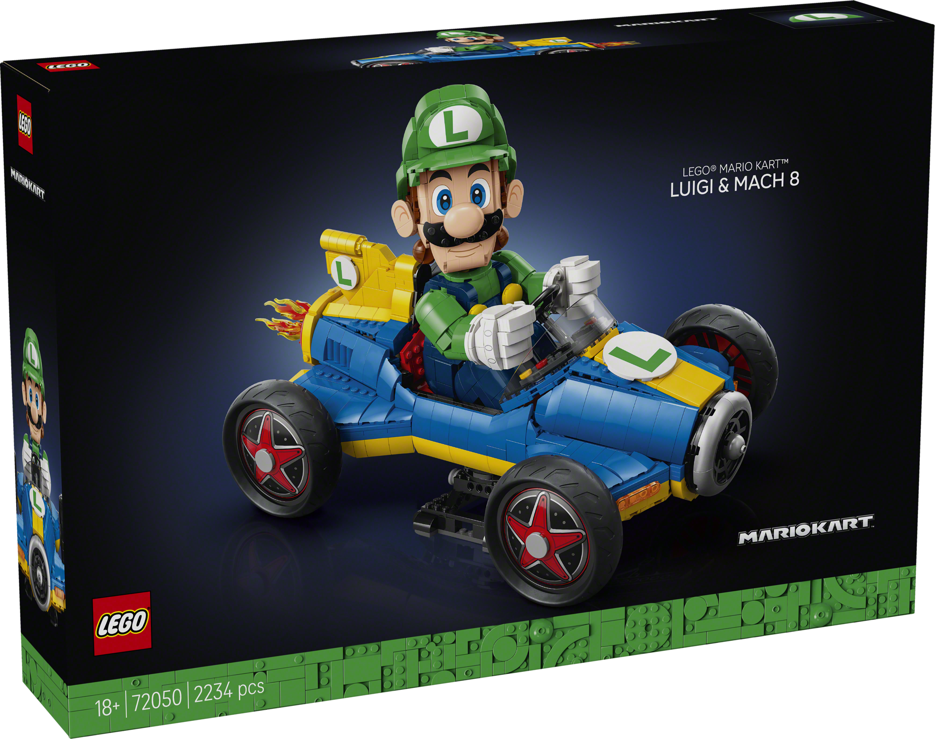 The latest 18+ set for the licensed gaming theme releases on the 1st of April 2026 and is the perfect companion to last year's extremely popular 72037 Mario Kart - Mario & Standard Kart. 72050 Mario Kart - Luigi & Mach 8, however, retails for $10 more at $179.99 / €179.99 / £159.99 but also includes almost 300 more pieces at a piece count of 2,234. These pieces create a large-scale brick-built version of the character Luigi driving his Mach 8 kart, which first appears in the Wii U's Mario Kart 8