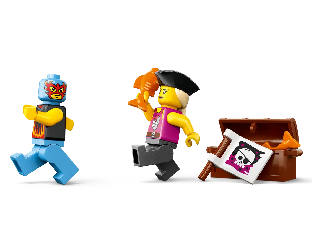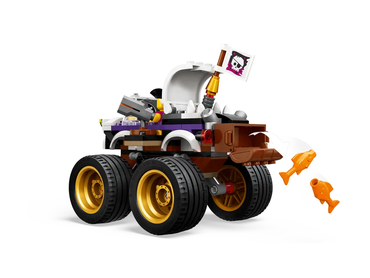 The three sets are 60395 Combo Race Pack, 60396 Modified Race Cars and 60397 Monster Truck Race. Across all three sets, we get a total of seven new vehicles perfect for both sea and land as 60395 includes a blue speedboat. That set also includes a red sports car and a yellow SUV but the more fun builds occur in 60396 and 60397. In these sets, we get some funky-coloured race cars and food and pirate-based monster trucks.